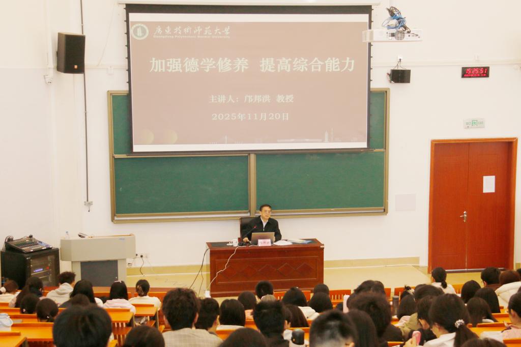 11月20日,学校原党委书记邝邦洪教授为河源校区学生作了题为《加强德学修养提高综合能力》的党课。关工委秘书处相关负责同志、河源校区四年全建制学院入党积极分子和发展对象及师生代表共200余人聆听党课。